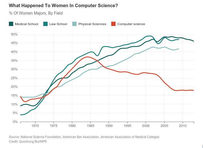 Šiuo metu dirbu srityje – informatikoje bei programinės įrangos inžinerijoje – kurioje moterų yra stebėtinai mažai (ir mažėja), ir į šią problematiką atkreipė dėmesį visos Silicio Slėnio vadovų grandys. Ypatingai keista dar ir tai, kad per paskutinius trisdešimt metų kompiuterių mokslą norinčių studijuot moterų sumažėjo, kai kitose srityse situacija lyg ir neturėjo tokio pokyčio.